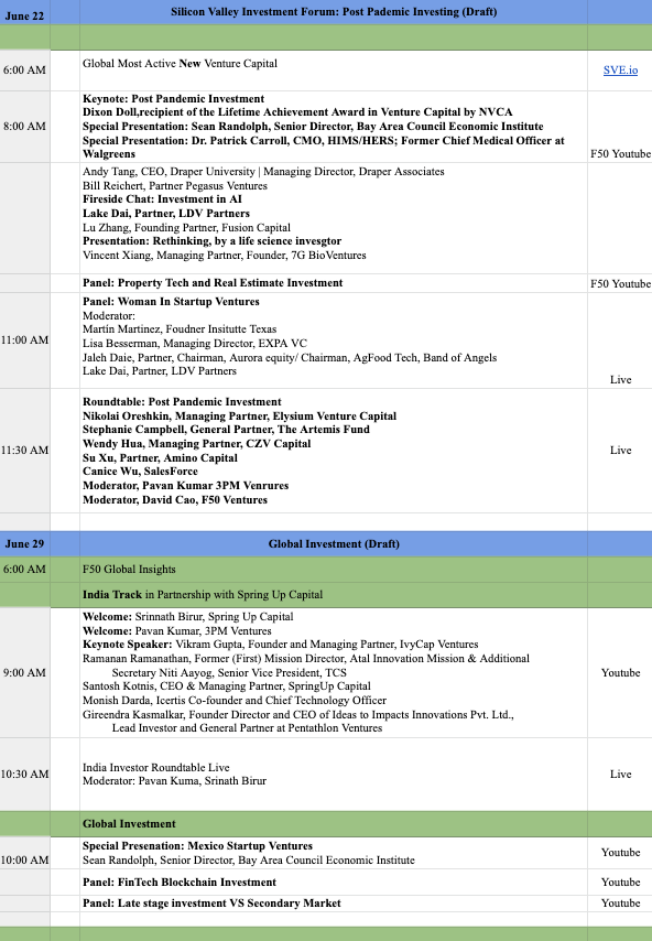 | LIVE @11:30 AM CST / 9:30AM PST Roundtable: Post Pandemic Investment Nikolai Oreshkin, Managing Partner, Elysium Venture Capital Stephanie Campbell, General Partner, The Artemis Fund Wendy Hua, Managing Partner, CZV Capital Su Xu, Partner, Amino Capital Canice Wu, SalesForce Moderator, Pavan Kumar, 3PM Venrures Moderator, David Cao, F50 Ventures |