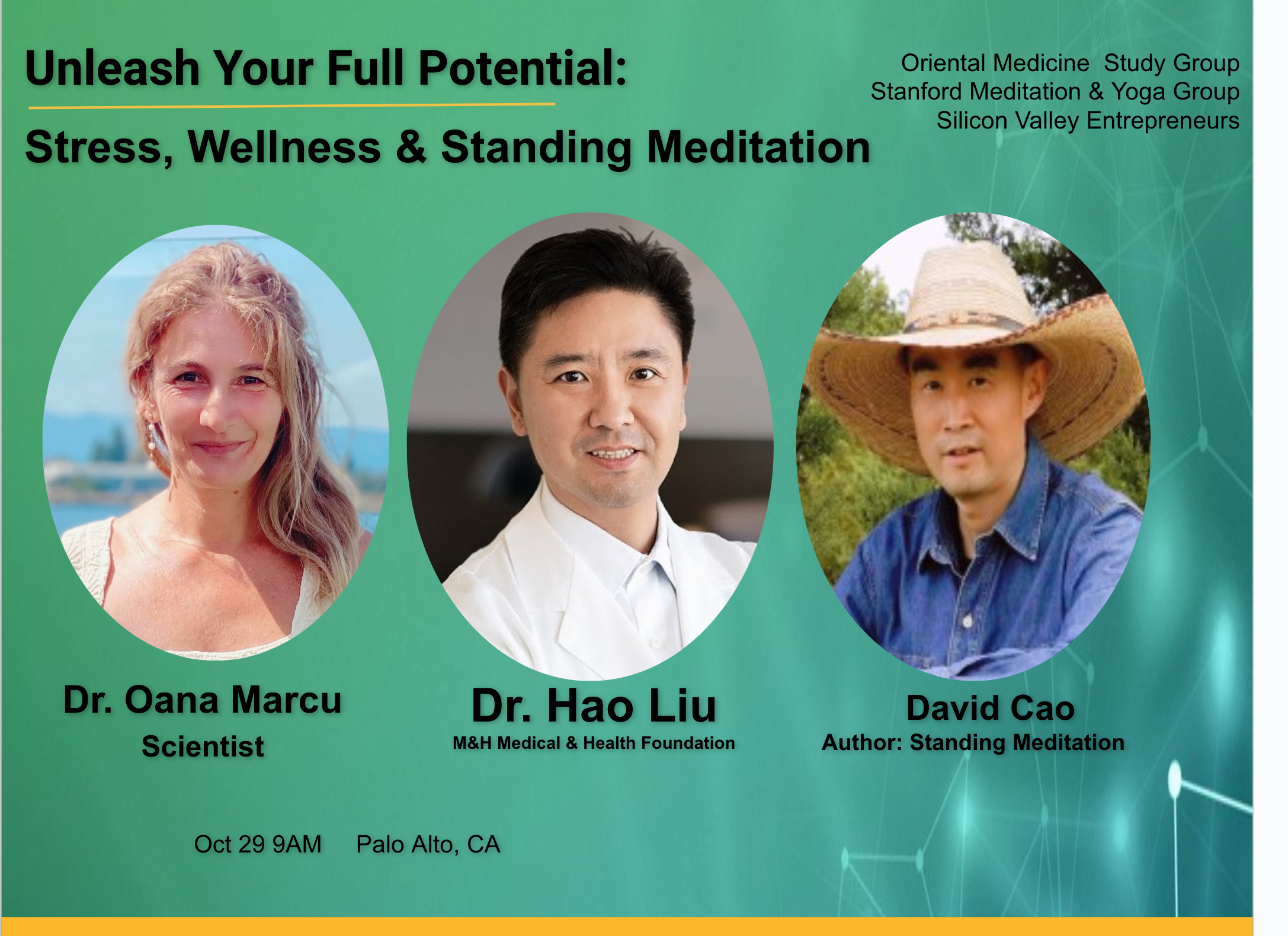 Join us for a transformative experience at our “Stress, Wellness, and Standing Meditation Workshop,” led by two distinguished experts: former NASA scientist, Dr. Oana Marcu, and renowned author of “Standing Meditation,” David Cao.