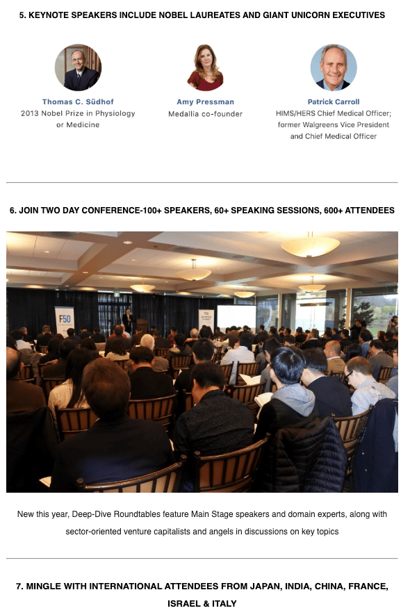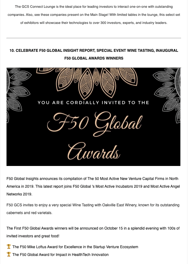 GCS brings together primarily investors with industry leaders and key players in an exclusive two-day forum that features over 60 sessions on multiple stages for 600 investment professionals and leaders from around the world in the early-stage investment, corporate ventures, HealthTech, AgricultureTech, Sustainability, and Social Impact sectors. Check out the amazing agenda, speakers, and attendees list online at https://f50.io/gcs.