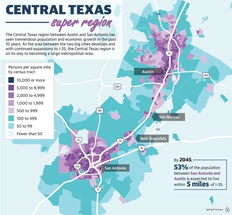 The Austin San Antonio Region combines the nation’s No. 1 fastest-growing region, the Austin Metro, and the No. 8 fastest-growing metro, the San Antonio Metro.It includes 2022 nation’s fastest growing city #1 Georgetown, #2 Leander, #5 New Braunfels.