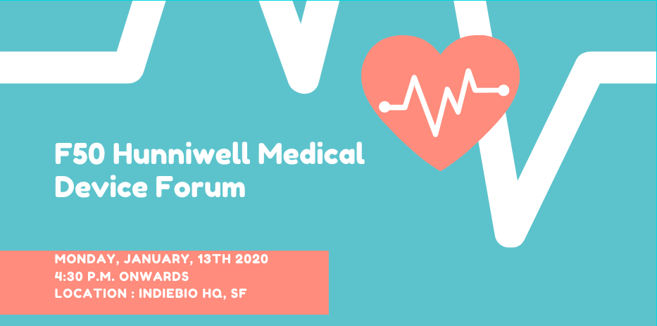 F50 corporate network would like to invite investors and corporate executives to join us for the F50 Hunniwell Medical Device Forum at 4:30 PM on Monday, January 13th. This invitational event is taking place alongside the JP Morgan Healthcare Conference, which will rally a global army of Health Transformers in medical devices who are reimagining the future of health. Date: Monday, January 13rd, 2020Time: 4:30pm - 7:30pmLocation: IndieBio (Registration/Invitation required, no walk-ins) The F50 Hunniwell Medical Device Forum brings together corporate executives, venture capitalists, and select startups. Hear expert investors share their insights, visit the startup showcase, and get exclusive access to the most promising HealthTech startups. We are accepting applications for a limited number of passes for qualified investors, health tech leaders, and health tech startups. All requests will be reviewed and a confirmation email will be sent upon acceptance.